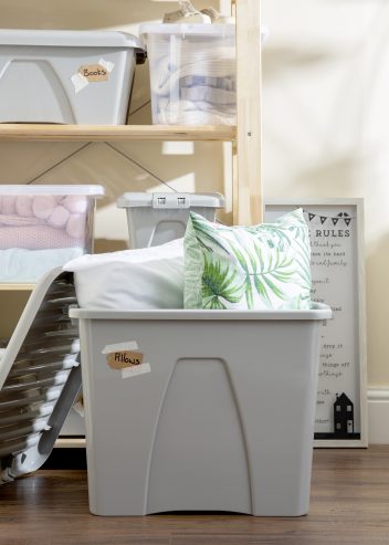 Contemporary design storage box & lid in modern soft grey colour. Versatile storage solution for the home. Approx. 75L capacity. 100% recycled and recyclable.